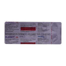 About Bladmir-50 Tablet Bladmir-50 Tablet belongs to the group of medications called urinary antagonists’ or ‘antispasmodics’ primarily used to treat overactive bladder (OAB) symptoms. Overactive bladder is a condition in which the urinary bladder muscles constrict uncontrollably, thereby causing an urgent need to urinate, frequent urination, and an inability to control urination. Bladmir-50 Tablet contains mirabegron that relaxes the urinary bladder muscles, which in turn decreases the activity of the overactive bladder. In an overactive bladder, muscle contractions occur before the full expansion of the bladder, causing the patient to have frequent urges to urinate. Bladmir-50 Tablet stops these sudden contractions of urinary bladder muscles, thereby enabling control over urination. Thus, it increases the amount and volume of urine that can be held by the bladder. In some cases, Bladmir-50 Tablet may cause common side effects of Bladmir-50 Tablet , which are nausea, constipation, diarrhoea, headache, dizziness, and increased heart rate. Most of these side effects do not require medical attention and resolve gradually over time. However, if the side effects persist or worsen, consult a doctor. Do not take Bladmir-50 Tablet if you are allergic to any of its ingredients. Before taking Bladmir-50 Tablet , inform your doctor if you have kidney disease, liver disease, hypertension, urinary retention, angioedema, or a history of heart rhythm problems (including QT prolongation). Consult your doctor if you are pregnant or breastfeeding. Avoid driving or operating heavy machinery, as this medicine may cause dizziness.