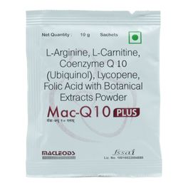 Mac Q10 Plus Sachet is a dietary supplement with several potential ways of contributing to overall health. Its key components are Coenzyme Q10, Folic Acid, L Arginine, Levocarnitine, Lycopene, Pine Bark Extract, Tribulus Terrestris Extract and Withania Somnifera Extract.